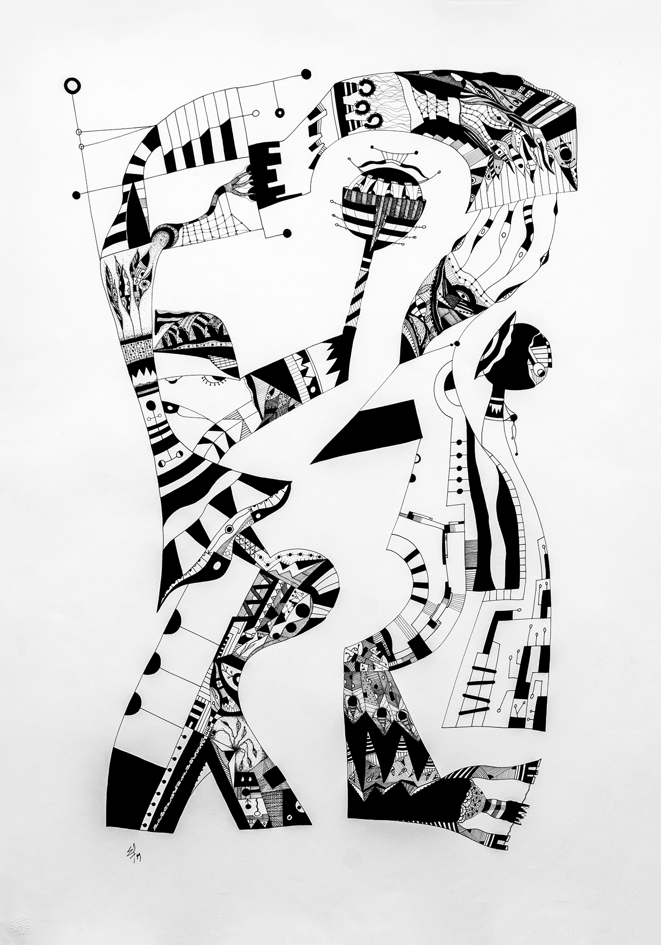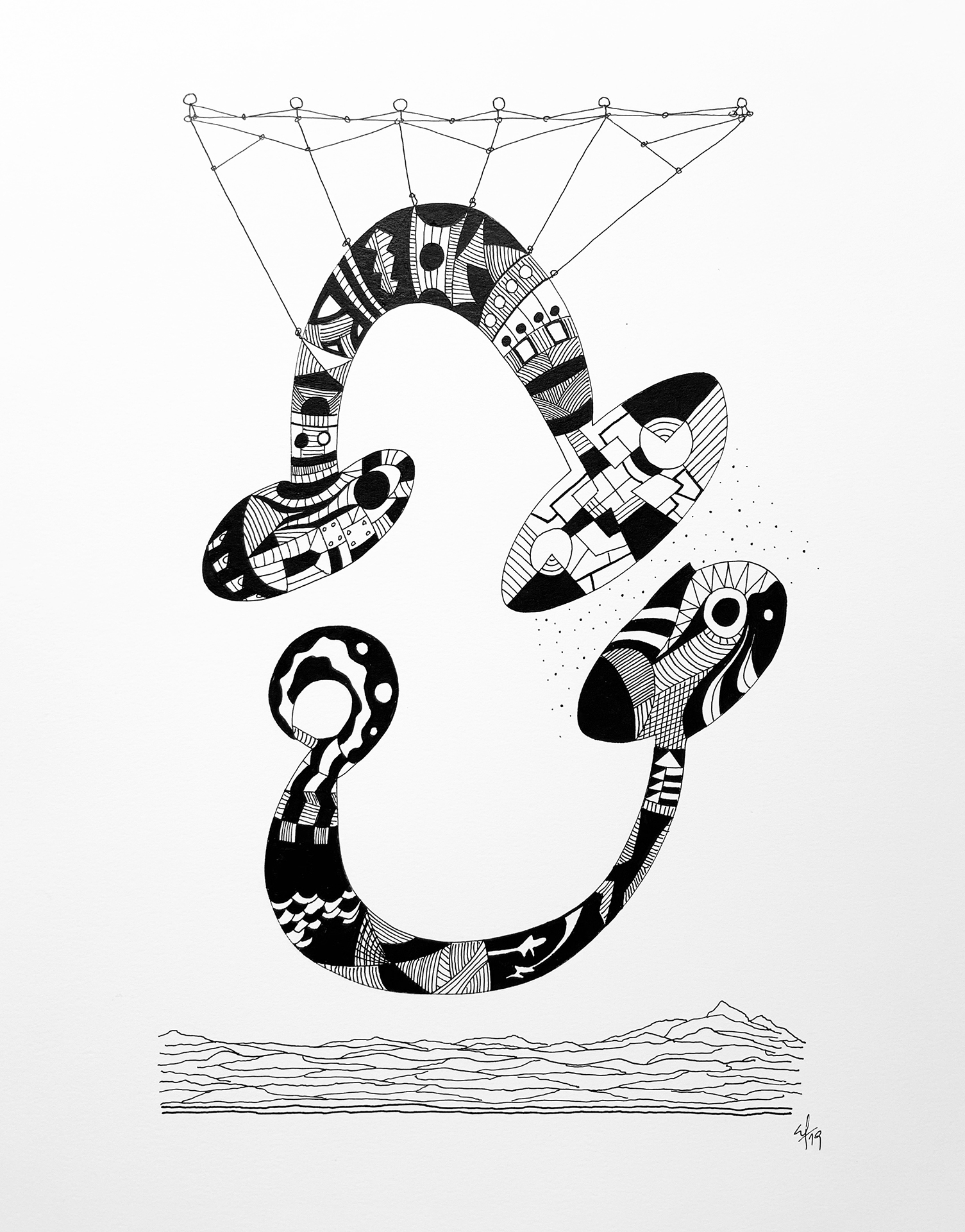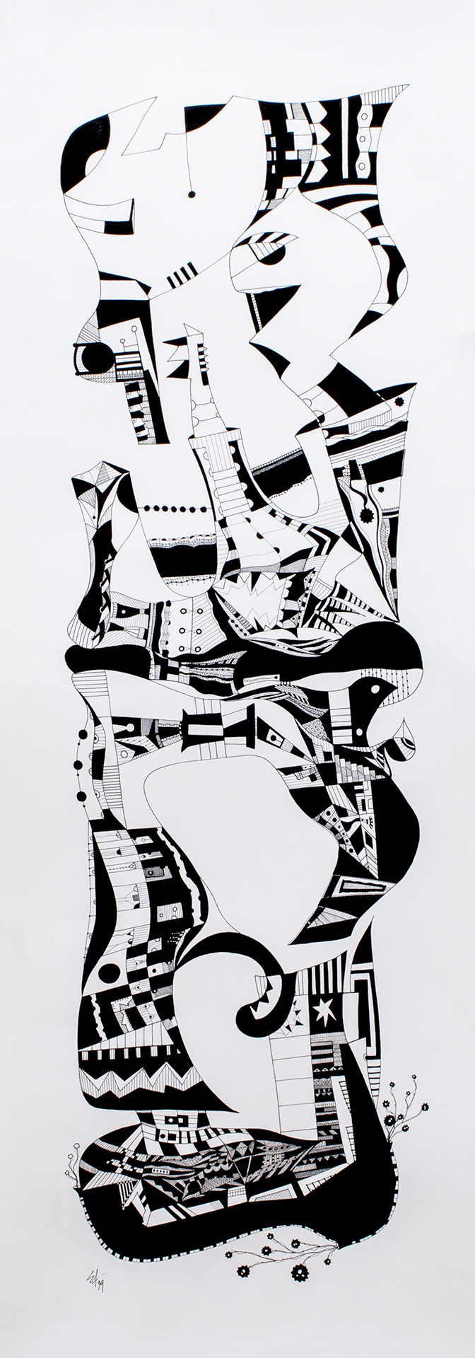 La serie "Patagonia 2019", presentada en la exposición "Por Otros Medios" en Patagonia Flooring Design & Art Center en 2019, ofrece una inmersión en paisajes y personajes surrealistas a través del uso de tinta negra sobre papel. Obras como "Magnético", "El Soberano", y "Lucha entre Dos Mundos" emplean la tinta para crear plenos y texturas, configurando escenas complejas y micromundos detallados. Cada pieza explora una realidad propia, desdibujando los límites entre el espacio y las figuras en un diálogo constante de contrastes y formas. La serie destaca cómo estos contrastes revelan la riqueza de los detalles y las texturas, construyendo así mundos imaginarios y surrealistas que invitan al espectador a una experiencia visual envolvente.