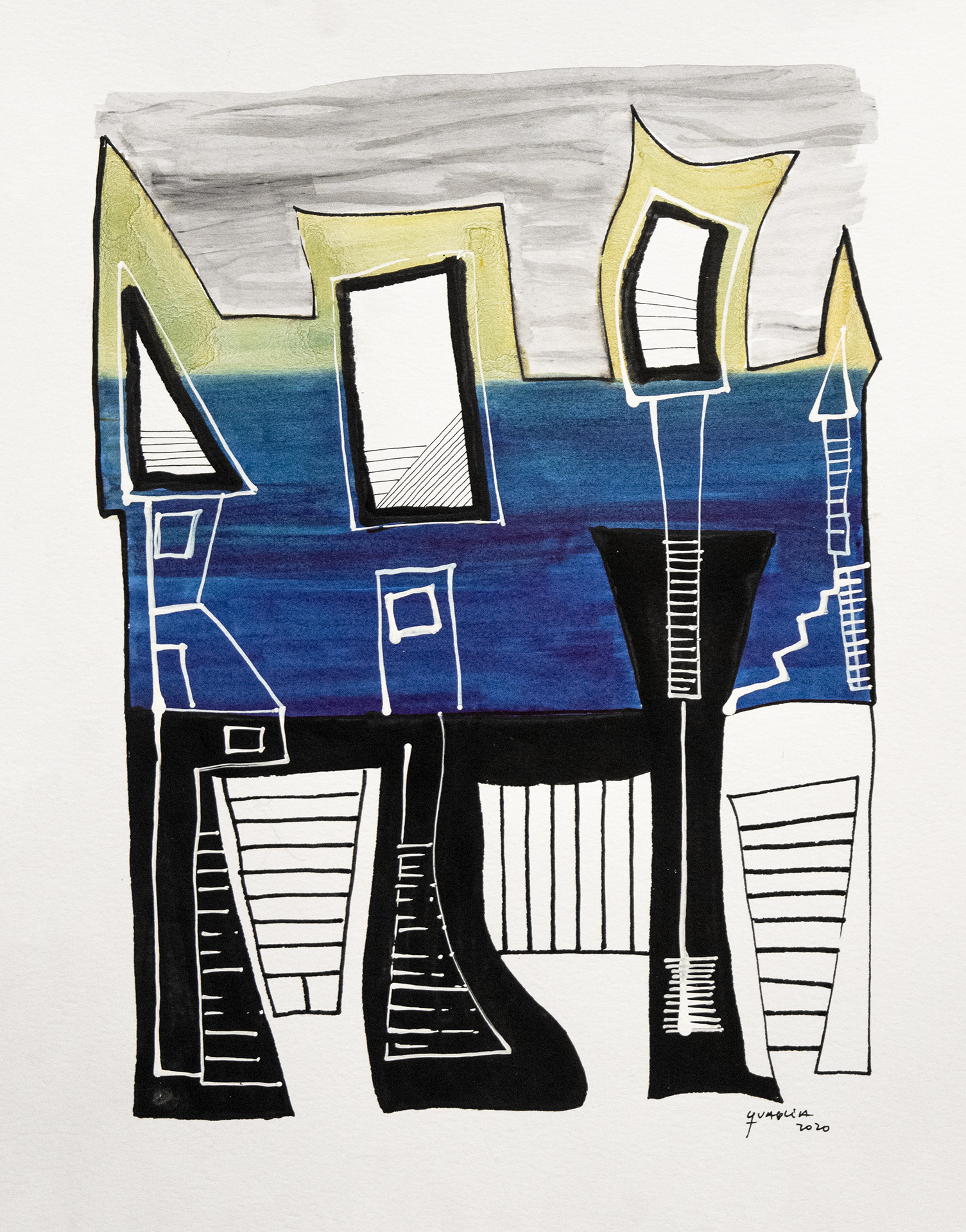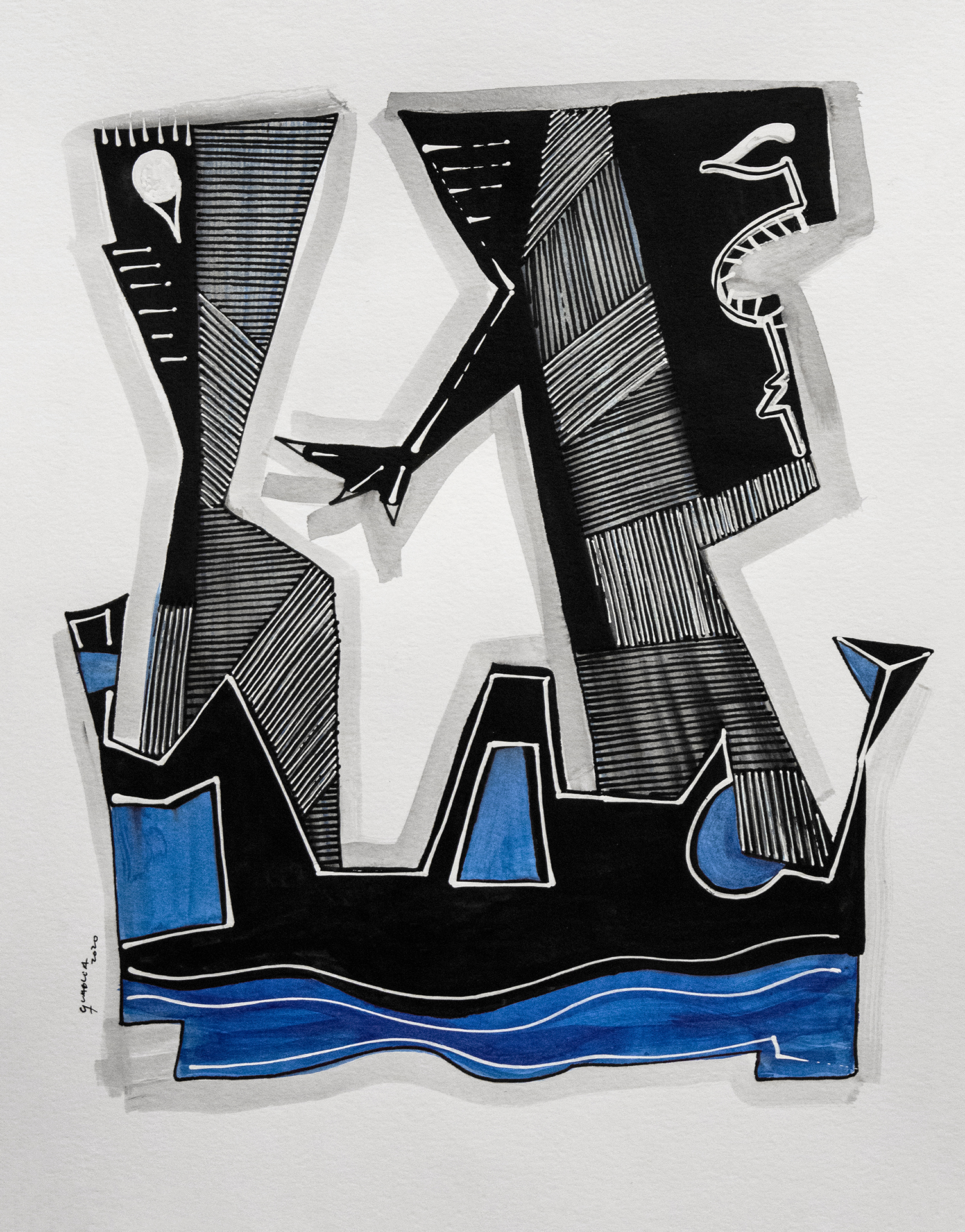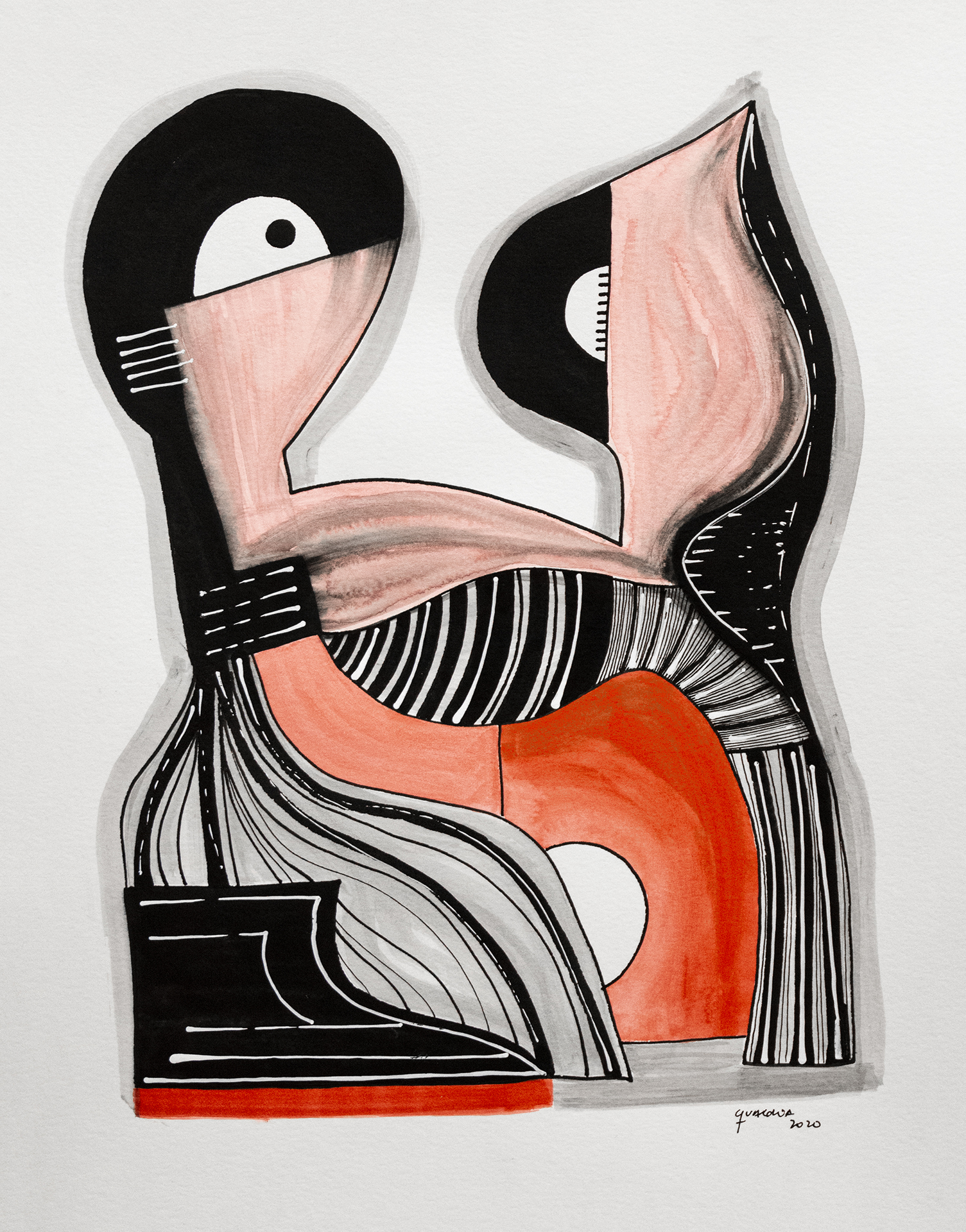 La serie "Tiempo Gris" ofrece una visión del mundo exterior a través de paisajes y escenas que capturan la interacción entre personajes y su entorno. Con títulos como "Urbanika", "Amor Gráfico", y "Doble Vuelo", las obras utilizan tinta y acrílico para crear composiciones vibrantes en las que predominan los tonos de color. Los trazos en blanco y negro definen y contrastan las formas, destacando la morfología de los personajes y los elementos del paisaje. "Tiempo Gris" explora cómo el entorno externo influye en la percepción de los personajes, reflejando una conexión dinámica entre el mundo exterior y sus habitantes.