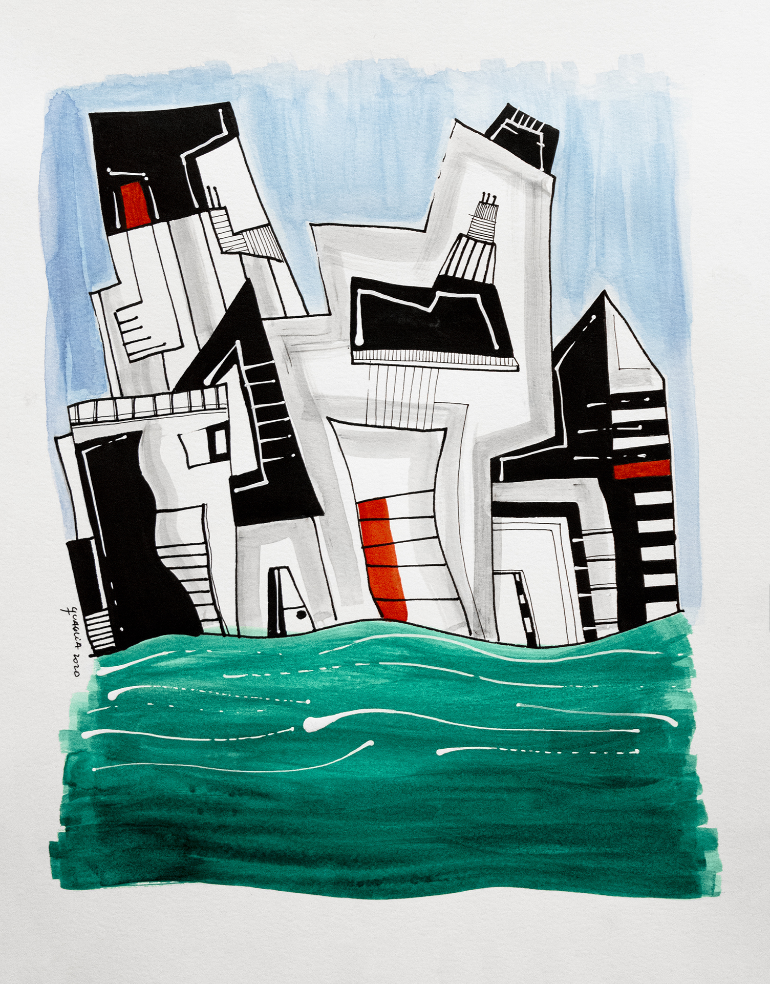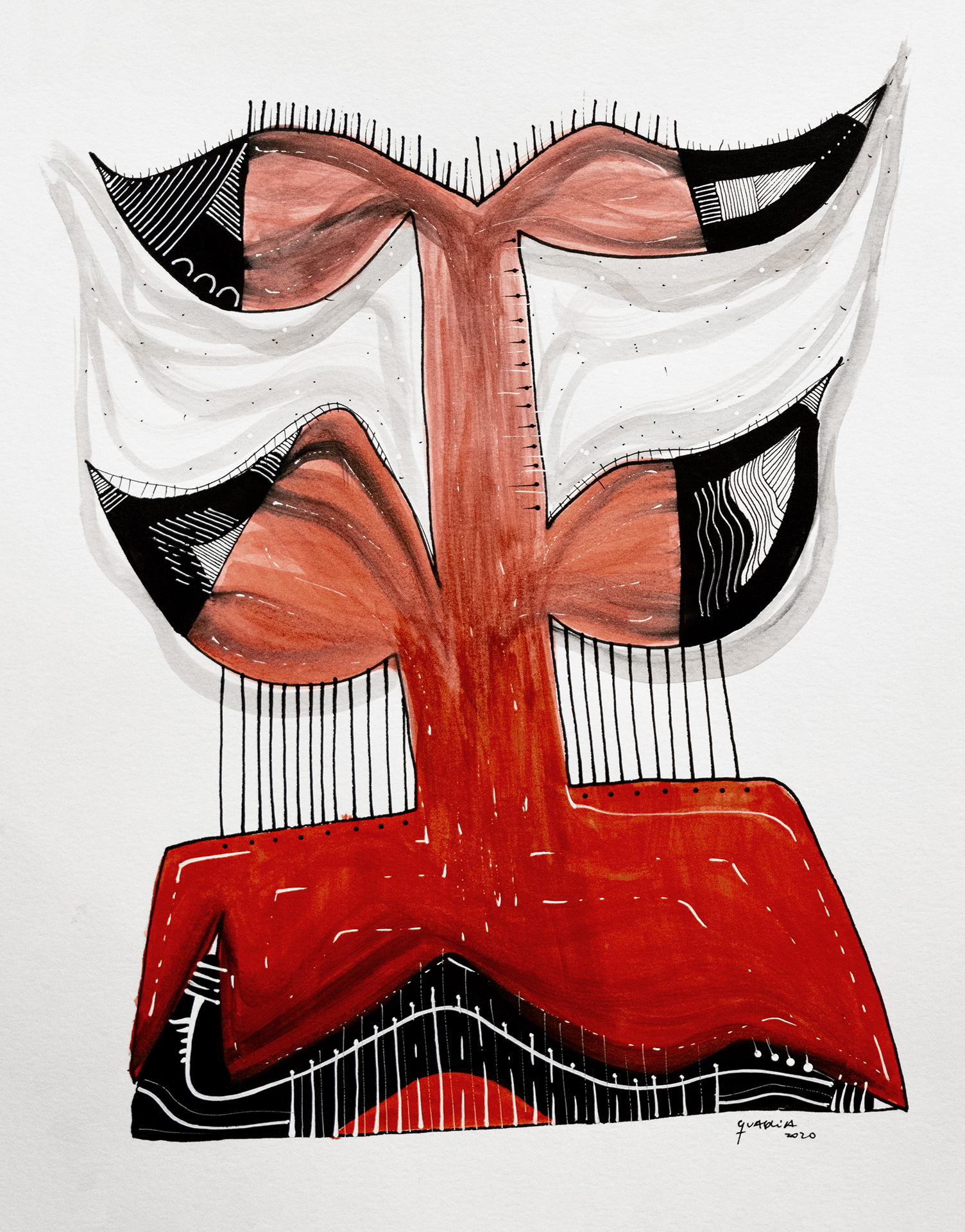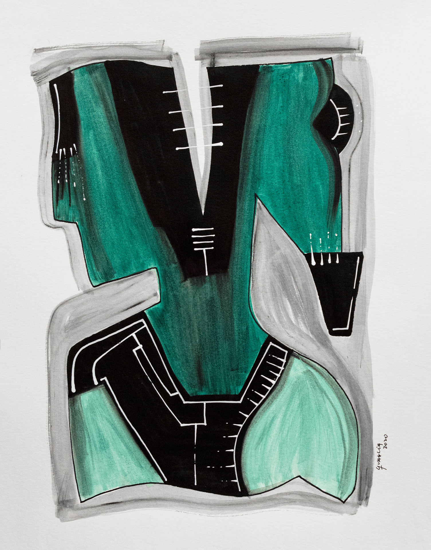 La serie "Tiempo Gris" ofrece una visión del mundo exterior a través de paisajes y escenas que capturan la interacción entre personajes y su entorno. Con títulos como "Urbanika", "Amor Gráfico", y "Doble Vuelo", las obras utilizan tinta y acrílico para crear composiciones vibrantes en las que predominan los tonos de color. Los trazos en blanco y negro definen y contrastan las formas, destacando la morfología de los personajes y los elementos del paisaje. "Tiempo Gris" explora cómo el entorno externo influye en la percepción de los personajes, reflejando una conexión dinámica entre el mundo exterior y sus habitantes.
